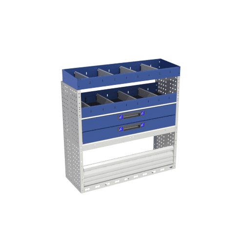 Linker comfortmodule voor L1 Courier met wielkastafdekking met klapfront, legplank met twee 360 ​​mm diepe laden, legplank met tussenschotten en toplegbord.