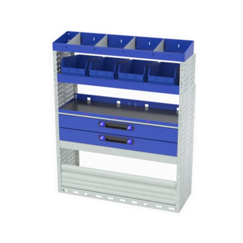 Transit Custom bestelwagen ombouw bestaande uit een wielkastafdekking met afsluitbare deur, twee lades, een legbord voor koffers, een legbord met  uitneembare bakjes en een toplegbord.