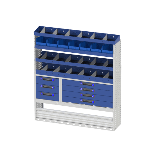 Het COMFORT-rek aan de rechterkant van de Transit omvat wielkastafdekkingen met sluitdeur, 2 lades met lades, 3 planken met verdelers en verwijderbare blauwe containers.