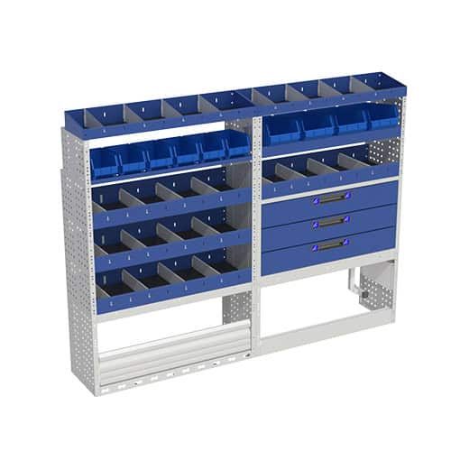 Linker Comfort Module voor Renault Master L1 H1 bestelwagen. Wielkastafdekking met klapfront en kofferklem. Vier legborden met schotjes, drie lades, twee legborden met uitneembare bakjes en toplegborden met verdelers.