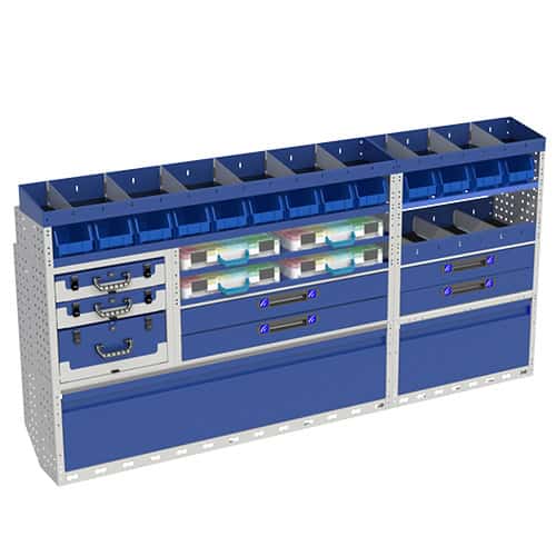 Luxe linker module ombouw voor de CITROËN JUMPY XL, ideaal voor professionals, niet alleen dankzij de vele lades, maar ook dankzij de vier koffers met kunststof bakjes, twee legplanken met tussenschotten, een lange legplank met 13 uitneembare bakken en legorden met tussenschotten.