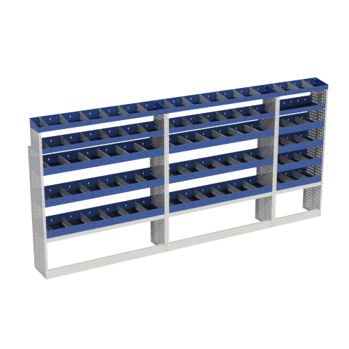 Linker basismodule voor Mercedes Sprinter LONG L3 H2 bestaande uit: 3 open wielkasten en 16 planken met uitneembare verdelers die je maximale flexibiliteit geven qua ruimte