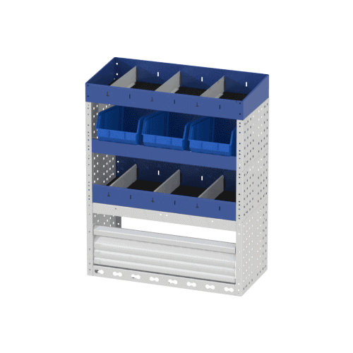 De opstelling die we voor de rechterkant hebben ontworpen verschilt niet veel van de linkerkant, sterker nog, we hebben ons beperkt tot alleen het formaat van de tegenhanger met de toevoeging van blauwe verwijderbare trays.
