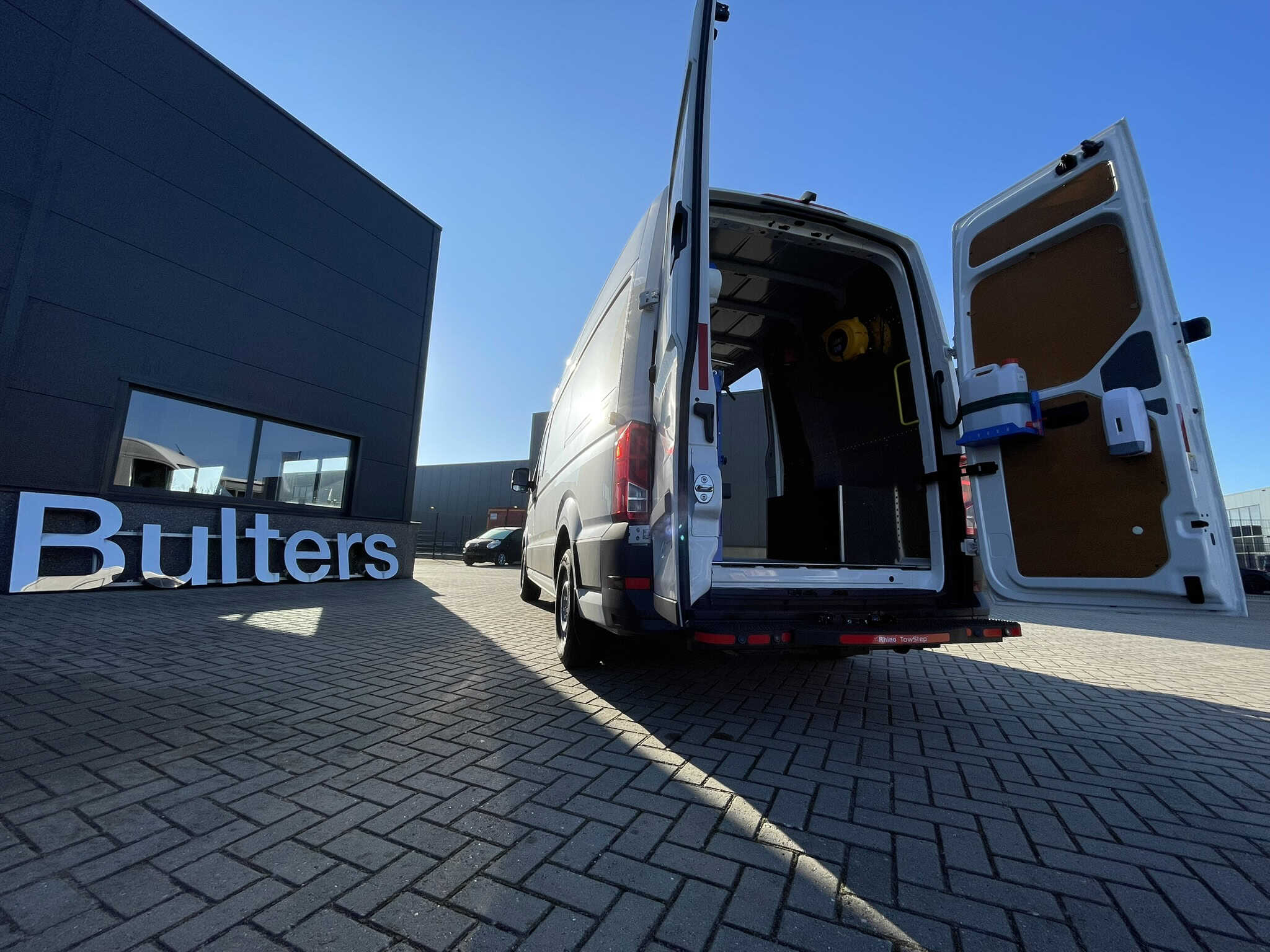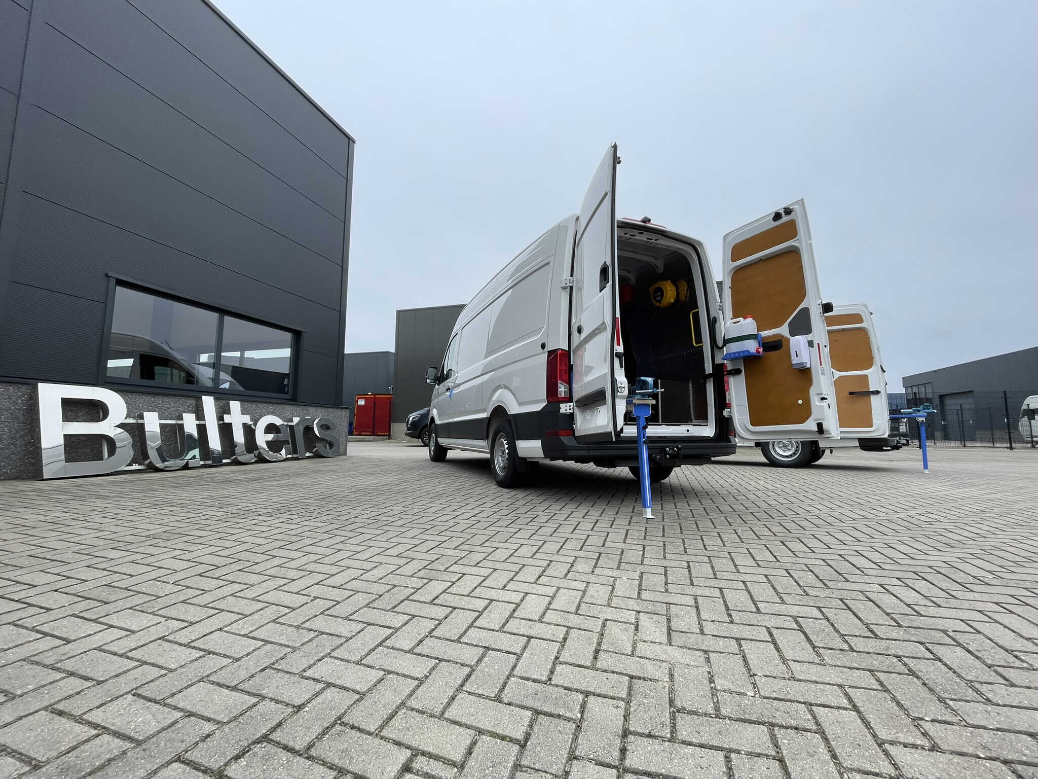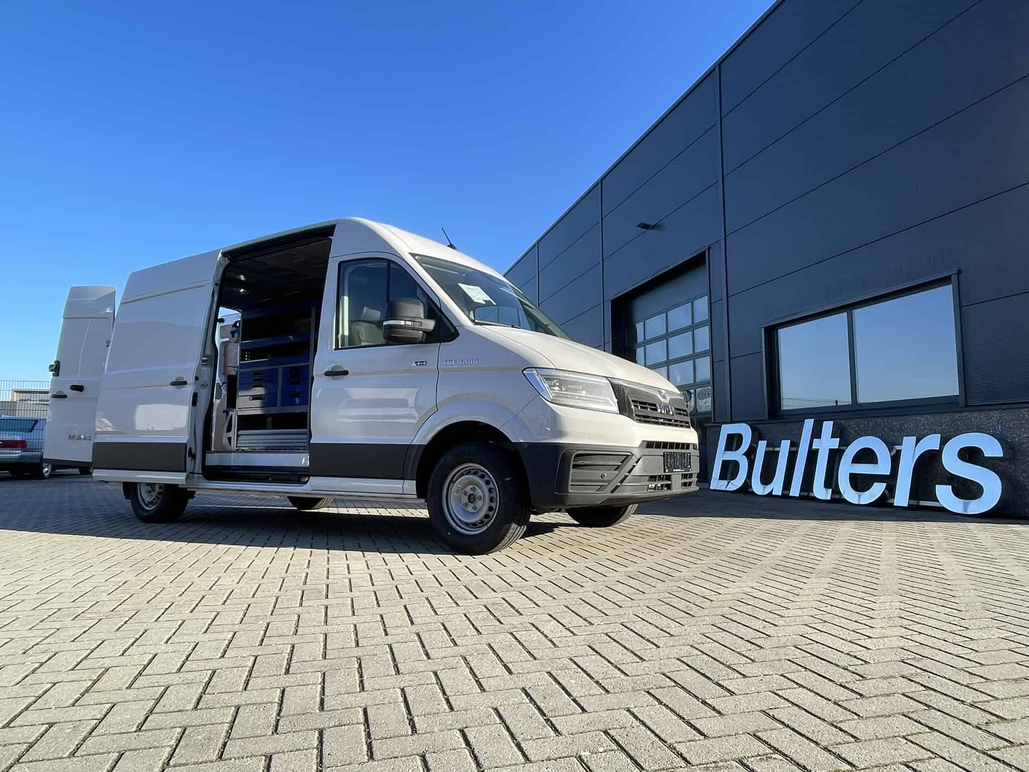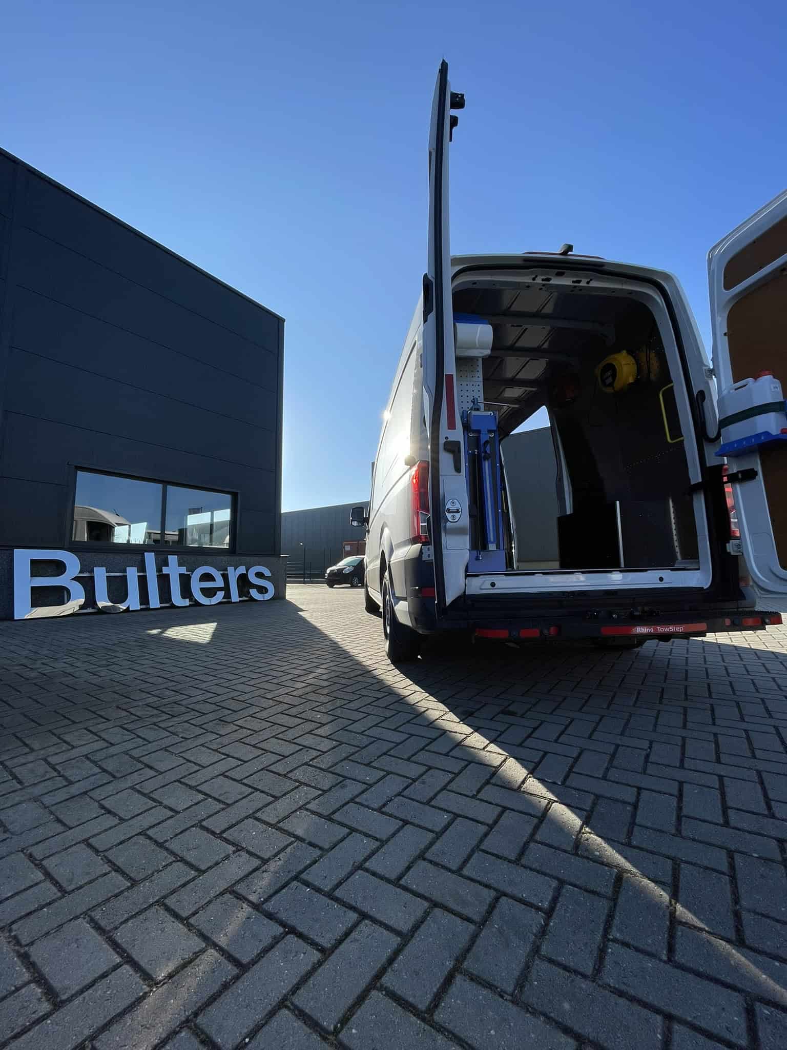 Bedrijfswagen met op maat gemaakte inrichting voor efficiënt transport en logistiek, geparkeerd voor een modern bedrijfsgebouw met de naam 'Bulters'.